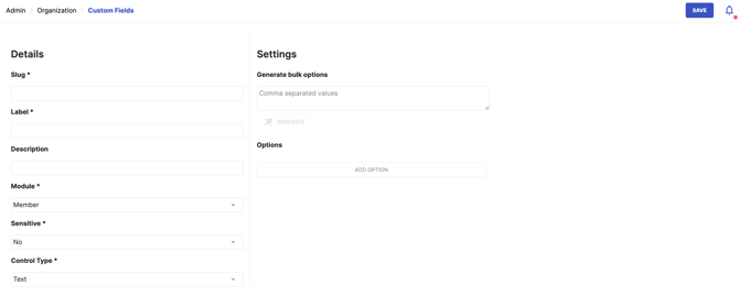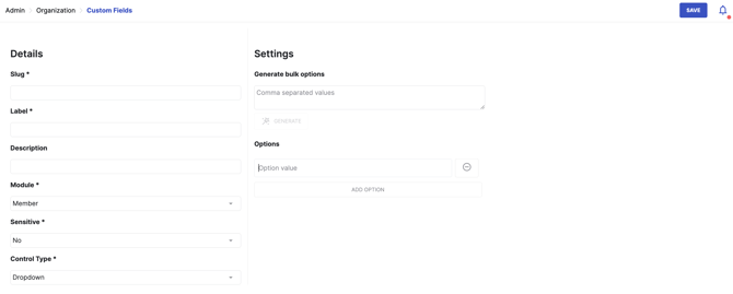 Enter your custom field name in the Slug field. The slug represents the column title exactly as it will appear for imports, exports, and API usage. It must be continuous text without spaces, use a hyphen (