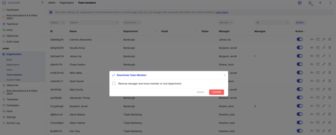 - Click “Remove Manager and move member to root department” to automatically unlink the team member from their manager and department. This helps streamline any future changes at the manager or department level.