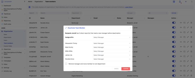 - You can reassign their team members to another manager. This can be done either in bulk (assign all team members to a single manager) or individually.