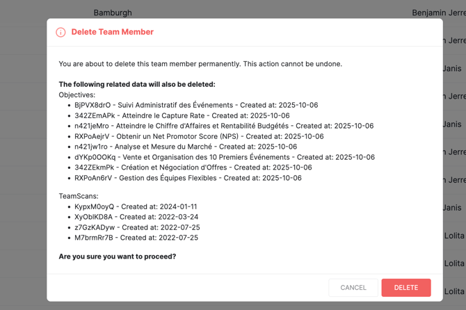 If you attempt to delete a Team Member, a warning message will appear to inform you about the permanent loss of their history: