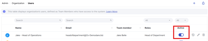 In the Organization section, go to your Team Members list and locate the team member you want to deactivate.