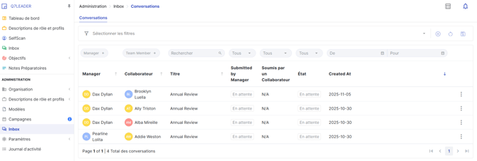 Dans la section Administration, sous le module Inbox, vous trouverez une vue d’ensemble de toutes les conversations de votre organisation.