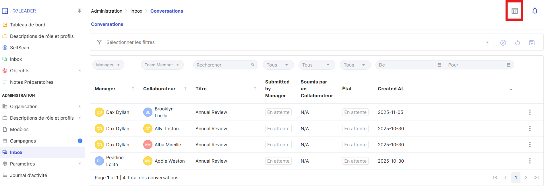 • En attente : la conversation est toujours en attente de soumission, soit par le Manager, soit par le Collaborateur, ou par les deux.