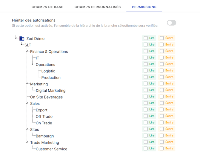 Par exemple, si vous activez les autorisations pour le département Finance & Operations, ses sous-départements — comme IT, Operations et Logistics & Production — seront également inclus.