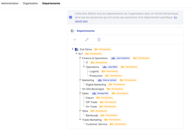 Pour consulter les autorisations que vous avez attribuées, cliquez sur l’icône Permissions à côté du nom du département.