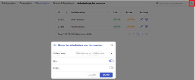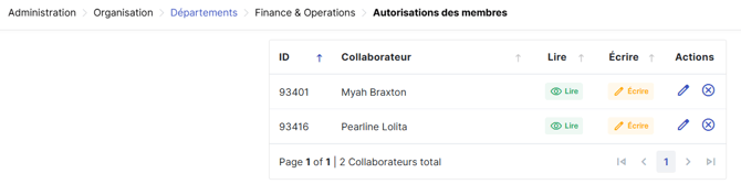 Cela affichera la liste de tous les droits d’accès actuels pour ce département. À partir d’ici, vous pouvez également gérer les autorisations en cliquant sur l’icône de modification (stylo) ou de suppression (corbeille).