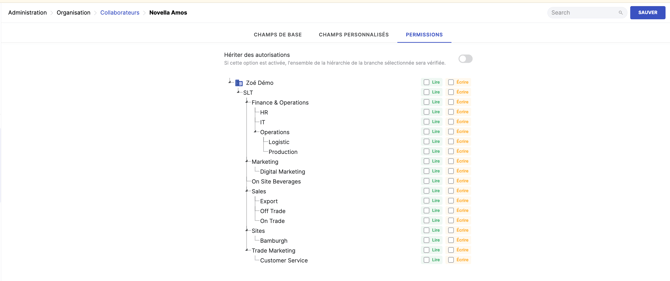 Exemple: vous pouvez permettre à un utilisateur de voir l’ensemble d’un département tout en limitant les droits d’édition à ses rapports directs. Cette étape est optionnelle. Par défaut, les utilisateurs ne voient que leurs rapports directs.