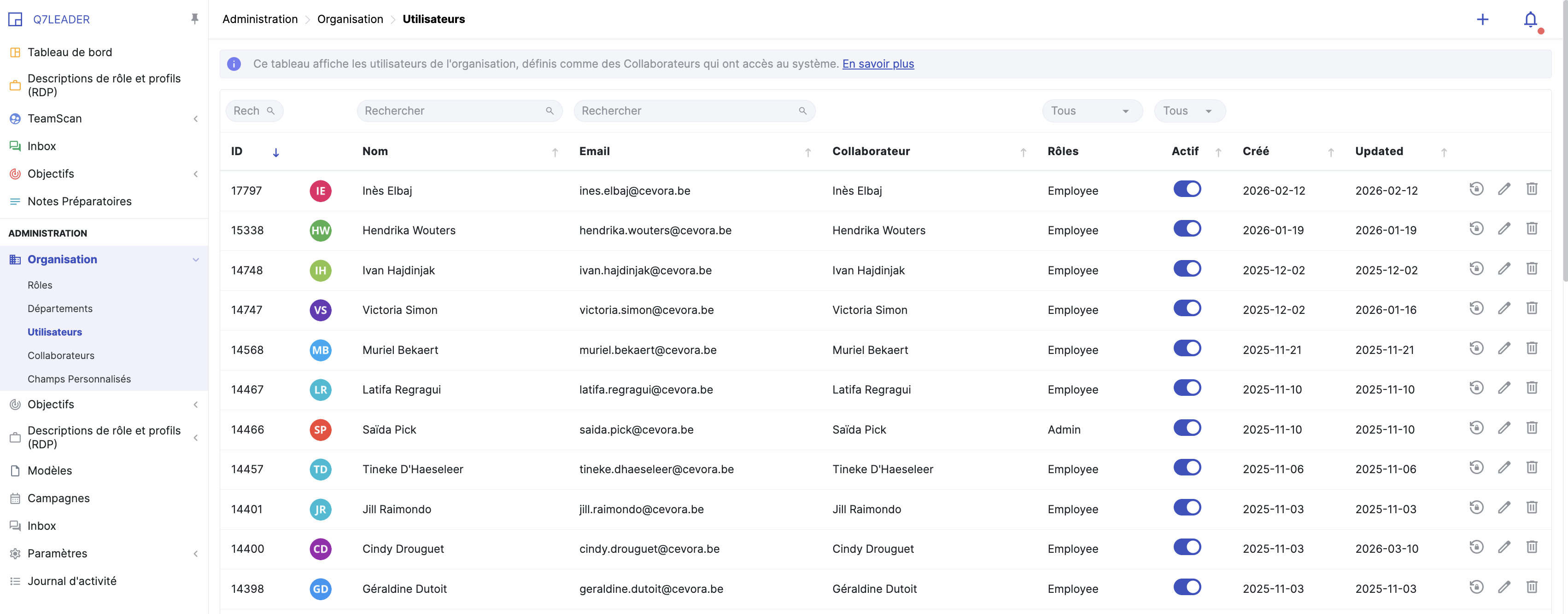 Les colonnes Crée et Updated indiquent quand un compte utilisateur a été créé et quand il a été mis à jour pour la dernière fois. Cela permet de suivre facilement qui a accepté son invitation et quand. C’est particulièrement utile pour identifier les utilisateurs lors d’une réinitialisation des soumissions.