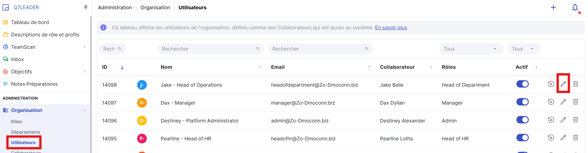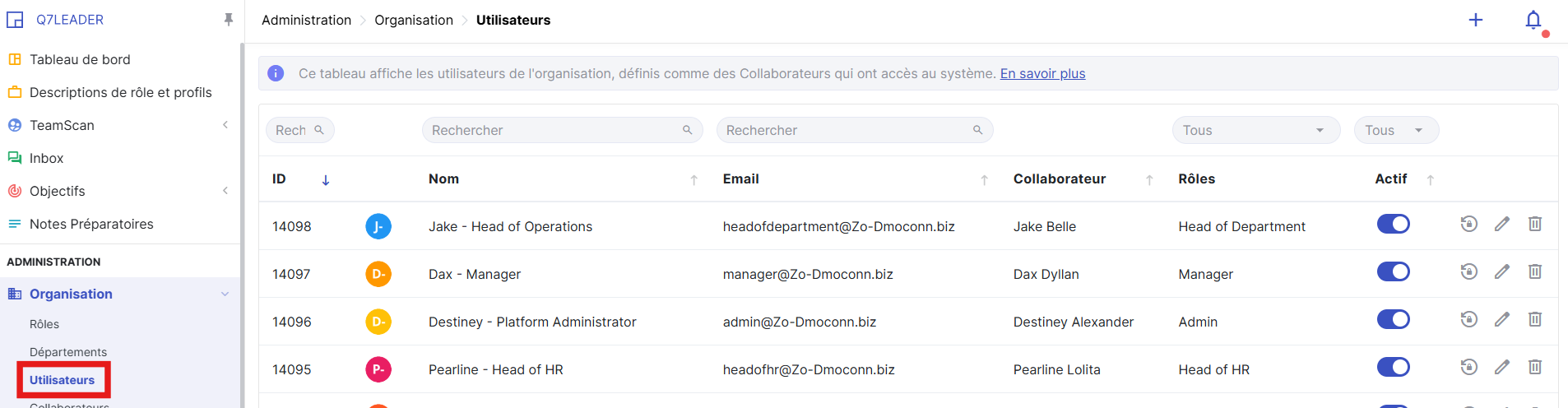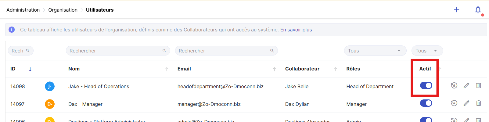 Utilisez le bouton Actif pour activer ou désactiver un utilisateur.