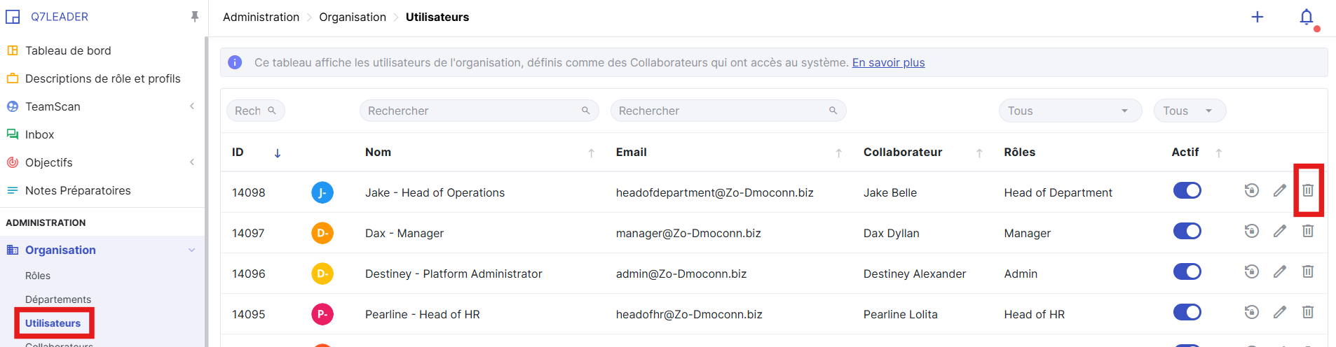 Pour supprimer un utilisateur, cliquez sur l’icône de la corbeille.