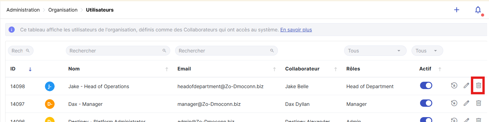 Lorsque vous désactivez un utilisateur, il n’a plus accès à la plateforme.