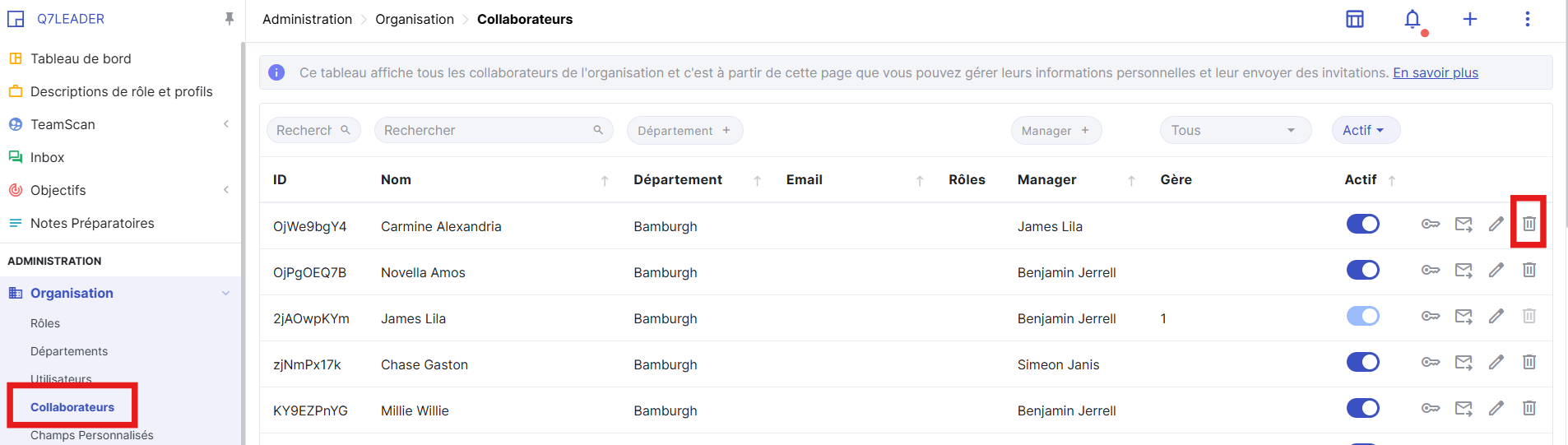 Ce guide explique comment les administrateurs peuvent identifier et supprimer des collaborateurs en double afin de maintenir le système précis et à jour.