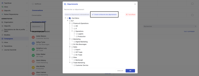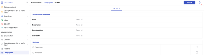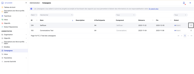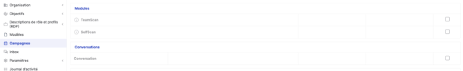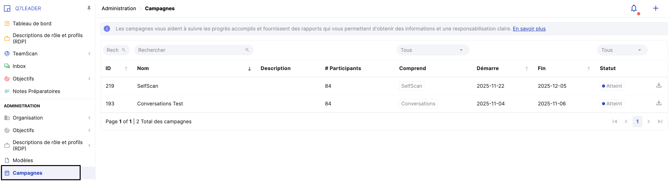 Les campagnes sont un outil puissant pour structurer des processus RH tels que TeamScan, SelfScan et Conversations. Grâce aux campagnes, les RH peuvent activer plusieurs modules avec des dates de début et de fin définies, attribuer des participants et suivre la progression en temps réel.