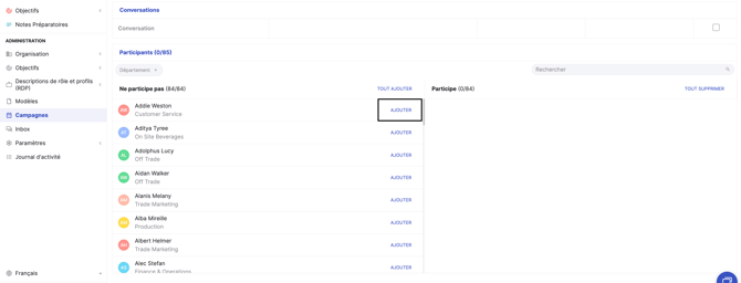Pour le module Conversations, les participants ajoutés ou supprimés après le lancement de la campagne n’auront pas leurs conversations automatiquement créées ou supprimées.