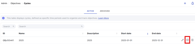 In the Cycles section, you can archive a cycle by clicking the icon on the right of the corresponding cycle.