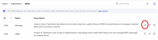 - To add or modify permissions for a specific role, click the fingerprint icon in the Actions column next to the role name.