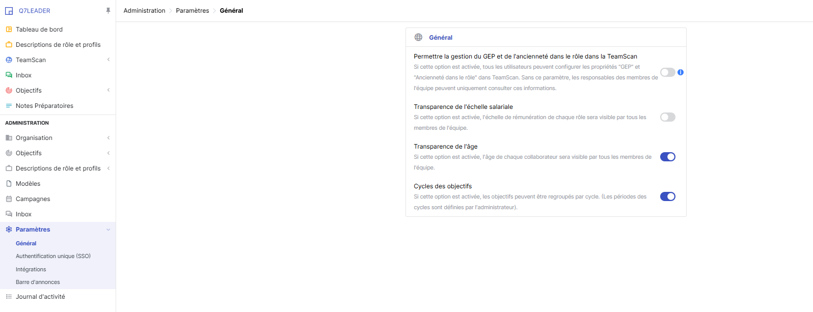 - Désactivé : Le manager peut voir ces informations mais ne peut pas les modifier. L’administrateur doit s’assurer que tous les rôles et collaborateurs sont correctement assignés afin que chacun dispose du GEP et de l'ancienneté dans le rôle appropriés.