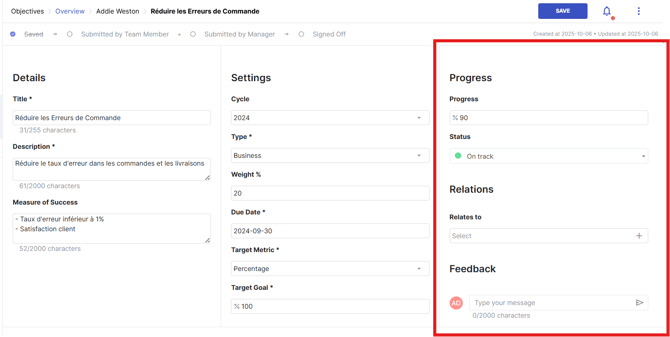 Submit: Indicates that you’re finalizing the objective. Once both you and your manager submit the same version, the objective is “Signed Off” and locked from further edits, except for feedback or progress updates.