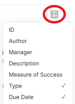 - Sortable columns by name, with the possibility to add/remove columns (Weight, Target, Last Update, Created Date).